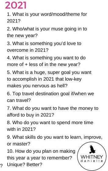 However, since 2021 is carrying out the foolishness of 2020, I have decided to look for other ways to better myself instead of falling into a salty pit of hate and frustration. I found this picture on Pinterest, asking 10 questions for 2021 by Whitney Danielle and I figured, ‘Hey why not’ and decided to answer them with my 2021 best intentions. Here is the picture if you would like to do it yourself. I believe you can find her information at Whitneydanielle.com